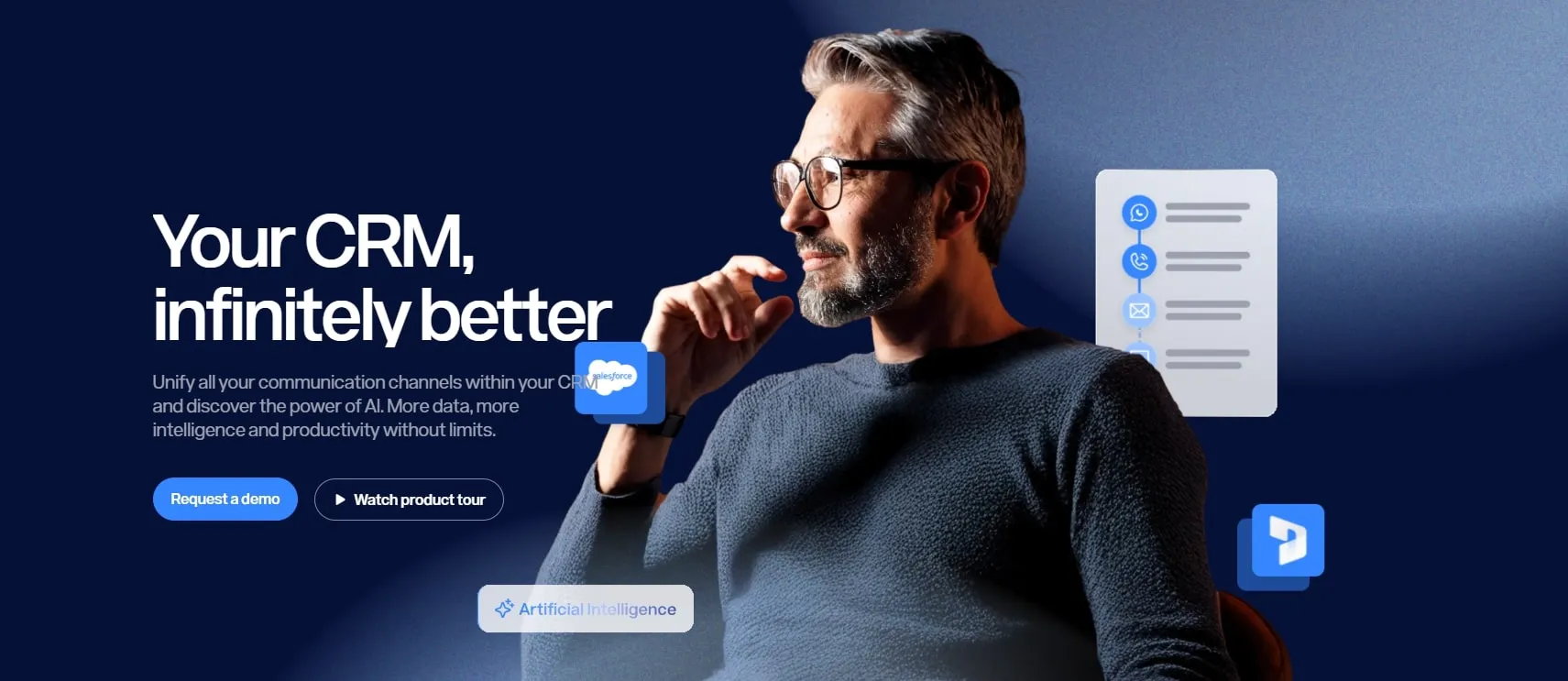 - Omnichannel integration: manage calls, emails, LinkedIn, and WhatsApp from a single interface.